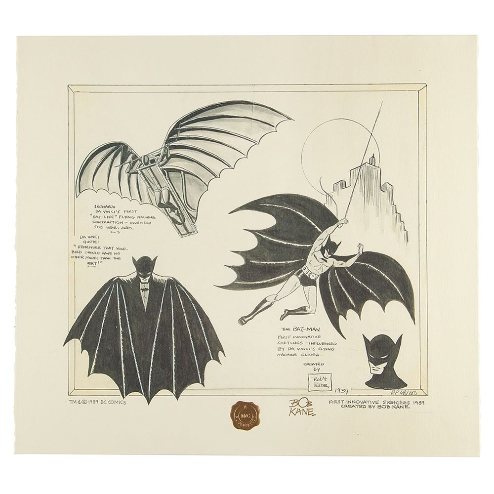 Fantastic limited edition 19 x 17.25 DC Comics print featuring Bob Kane's first innovative sketches of Batman, numbered PP 68/100, signed in the lower border in gold ink, "Bob Kane." Rolled and in fine condition.