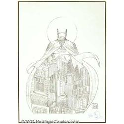 Bob Kane - Signed/Remarqued Batman Print (undated). A moody black and white piece that hearkens back to the earliest years of "The Bat-Man" as the Caped Crusader looms over an exquisitely-rendered Gotham City. The remarque, in the lower right hand corner, is a profile head sketch of Batman, rendered in his creator's hand. 26" by 34", matted.  Important notice: We expect to be auctioning lots at the rate of 200-250 per hour. Sometimes eBay Premier live bid software cannot keep up with that pace, so we strongly recommend that you place a realistic proxy bid now as insurance to avoid disappointment. Also please note that all Heritage/CAA lots purchased through eBay Premier carry a 20% Buyer's Premium.
