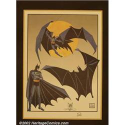 Bob Kane - Signed/Remarqued Batman Print (undated). A striking color piece depicting the Batman in poses reminiscent of his earliest adventures. The remarque in the lower center of the print is of Batman's head, drawn by his creator. 26" by 34" inches, double matted.  Important notice: We expect to be auctioning lots at the rate of 200-250 per hour. Sometimes eBay Premier live bid software cannot keep up with that pace, so we strongly recommend that you place a realistic proxy bid now as insurance to avoid disappointment. Also please note that all Heritage/CAA lots purchased through eBay Premier carry a 20% Buyer's Premium.