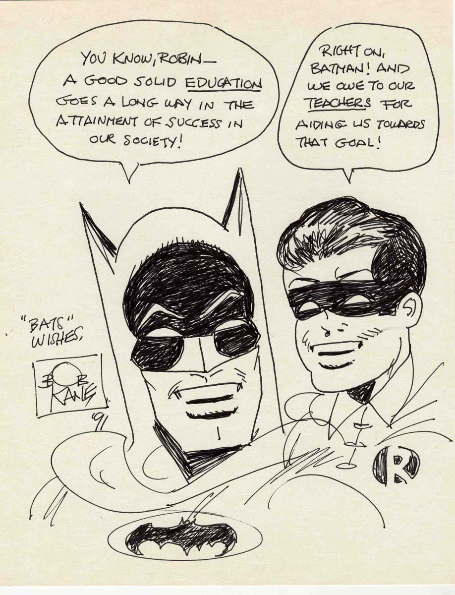 Fantastic piece of original art from Bob Kane, the famed Batman cartoonist, dated 1991. Here, Kane has penned a black ink drawing of Batman and Robin, and writes above the caped crusader, ''You know Robin, a good solid education goes a long way in the attainment of success in our society!'' Robin responds, ''Right on, Batman! And we owe to our teachers for aiding us towards that goal!'' The sketch, on white cardstock measuring 8'' x 10'', is signed ' ''Bats' Wishes, Bob Kane''. Fine condition.