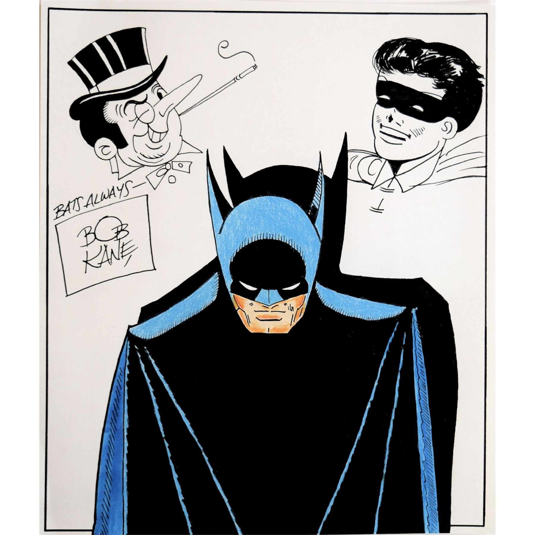 10 in. by 11 1/4 in. Hand Drawn Batman, Robin & Joker drawing by Bob Kane. Signed: Bats Always Ð Bob Kane