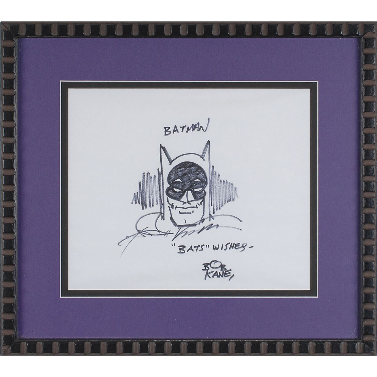 Original signed felt tip sketch of Batman on a white 9 x 7.5 sheet, titled at the top and signed below, “Batman, ‘Bats’ wishes—Bob Kane.” Double-matted and framed to an overall size of 14 x 12.5. In fine condition.