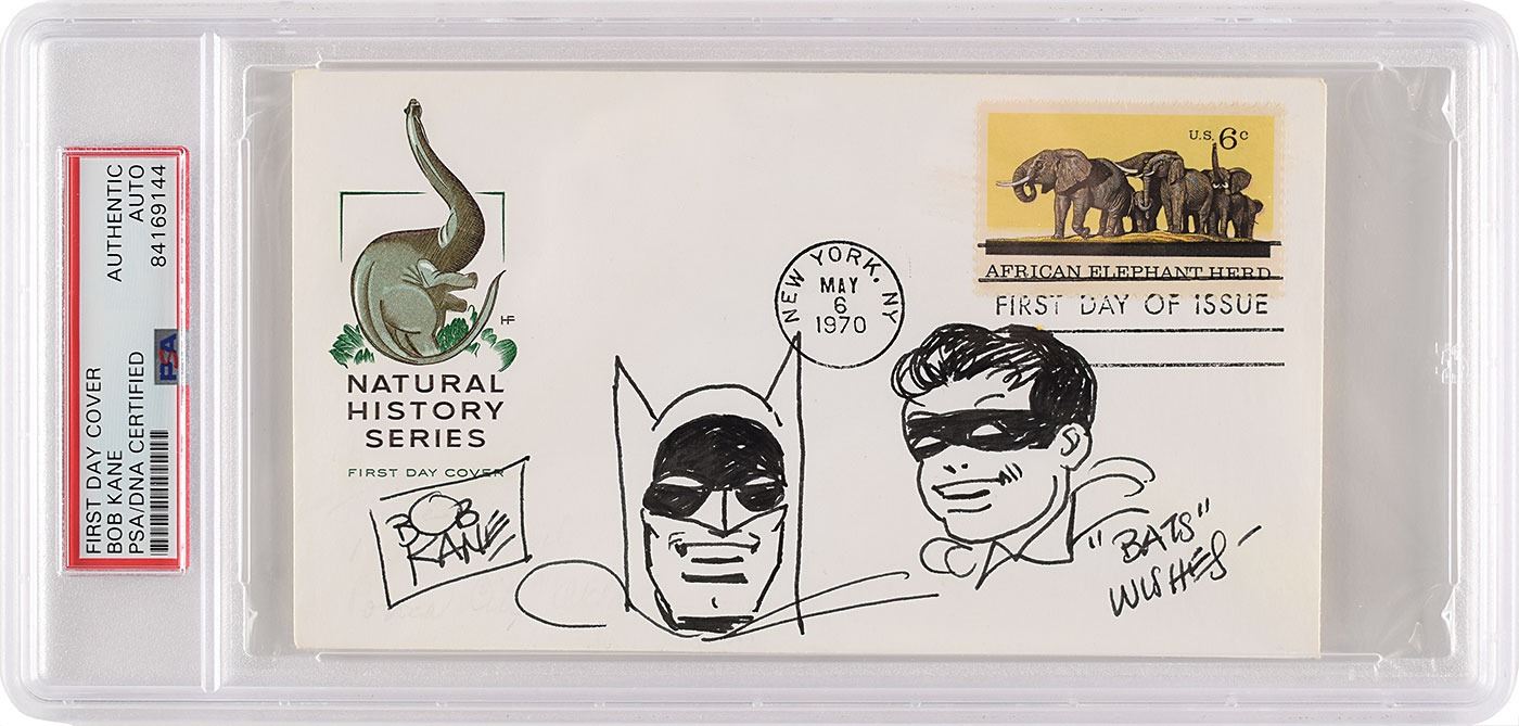Original ink sketch of Batman and Robin accomplished by Kane on a white 6.5 x 3.75 FDC honoring natural history, signed, "'Bats' wishes—Bob Kane." In fine condition. Encapsulated in a PSA/DNA authentication holder.