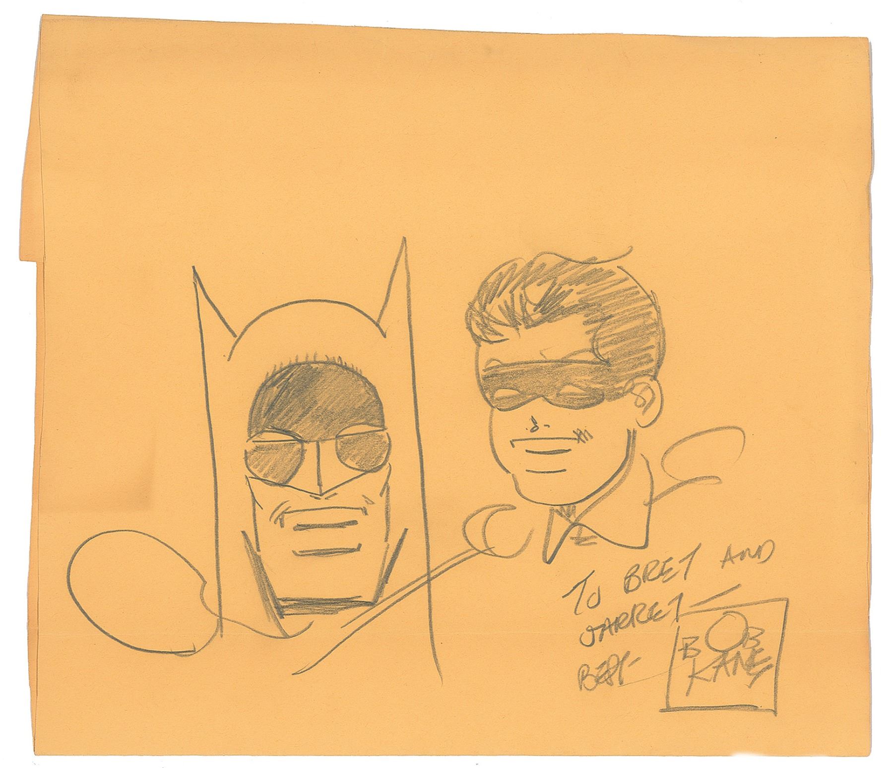 Original sketch of Batman and Robin by Bob Kane, accomplished in pencil on a trimmed 11 x 9.5 mailing envelope, signed and inscribed below, "To Bret and Jarret—Best, Bob Kane." In fine condition, with a horizontal fold across the bottom.