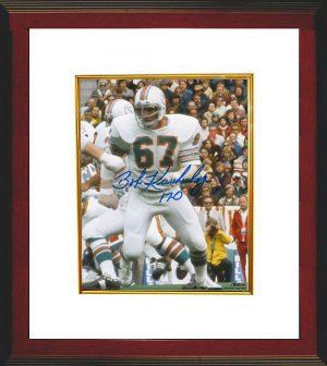 Bob Kuechenberg played offensive lineman for the Miami Dolphins for fourteen seasons between 1970 and 1983. He was a mainstay in a line that included Hall of Famers Jim Langer, Larry Little, and Dwight Stephenson and played in six Pro Bowls in the late 1970s and early 1980s. He was selected as one of the top 15 finalists for the Pro Football Hall of Fame from 2002–2006, and one of the top 17 finalists from 2007–2009, but missed the cut every year. Bob Kuechenberg has hand autographed this Miami Dolphins 8x10 Color Photo with 17-0 Inscription. Certificate of Authenticity from Athlon Sports. Custom White Mat and Premium Wood Framed as shown.