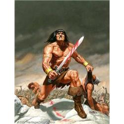 Bob Larkin - Original Painting for the Cover to Savage Sword of Conan #44 (Marvel, 19790). This intense oil painting is one of many that Bob Larkin did for Savage Sword of Conan making him a fan favorite. The exaggerated foreshortening thrusts Conan "in your face" and creates a ferocious giant that dominates the carnage strewn battlefield raging around him. Conan's stature challenges the viewer in the most intimidating way but, ironically, it is that essence which makes this a very engaging piece. Larkin's thinned down use of the oil media on thick number 80 cold press illustration board allows him the very detailed quality that he has become famous for and insures that this work of art will survive as was originally intended for years to come. The size of this piece measures 15"x19.75". Important notice: We expect to be auctioning lots at the rate of 200-250 per hour. Sometimes eBay Premier live bid software cannot keep up with that pace, so we strongly recommend that you place a realistic proxy bid now as insurance to avoid disappointment. Also please note that all Heritage/CAA lots purchased through eBay Premier carry a 20% Buyer's Premium. Please make sure you read the Terms and Conditions.