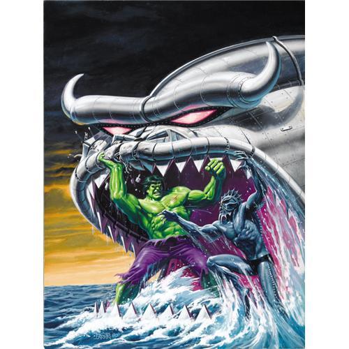<B>Bob Larkin - The Hulk Magazine #22 Cover Original Art (Marvel, 1980).</B></I> Thanks to the success and the popularity of the "Hulk" TV show starring Bill Bixby and Lou Ferrigno, the Hulk was given his own magazine starting in 1977. The mag formerly known as <B>Rampaging Hulk</B></I> boasted covers by many of the field's top talents. Bob Larkin delivered a Marvel masterpiece for issue #22 -- his bold and vibrant painting spotlights a startling scene from "The Failure of Hydropolis." This acrylic on board painting has an overall size of 15" x 20", and the art is in Excellent condition. This is an outstanding piece, perfect for any Hulk collector.