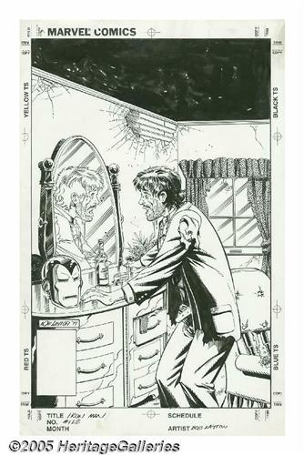 <B>Bob Layton - Iron Man #128 Unpublished Cover Original Art (Marvel, 1979).</B></I> Tony Stark's terrible struggle with alcoholism came to a head in <B>Iron Man</B></I> #128. The story, "Demon in a Bottle," which was plotted by Bob Layton and written by David Michelinie, is considered by many to be the greatest <B>Iron Man</B></I> story ever written. The Armored Avenger fought his battle with the bottle during one of the most famous Iron Man storylines of all time, which ran in issues #121-130. Here is an alternative unused cover for this reknowned issue, featuring pencils and inks by Bob Layton. The image area measures 10" x 15," and the work is in Excellent condition.