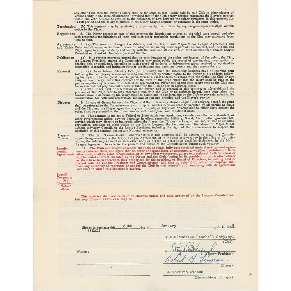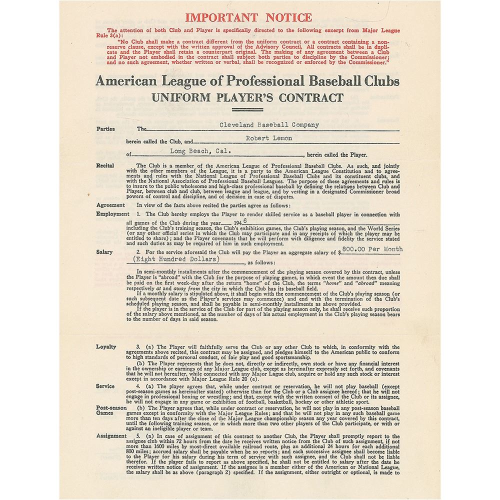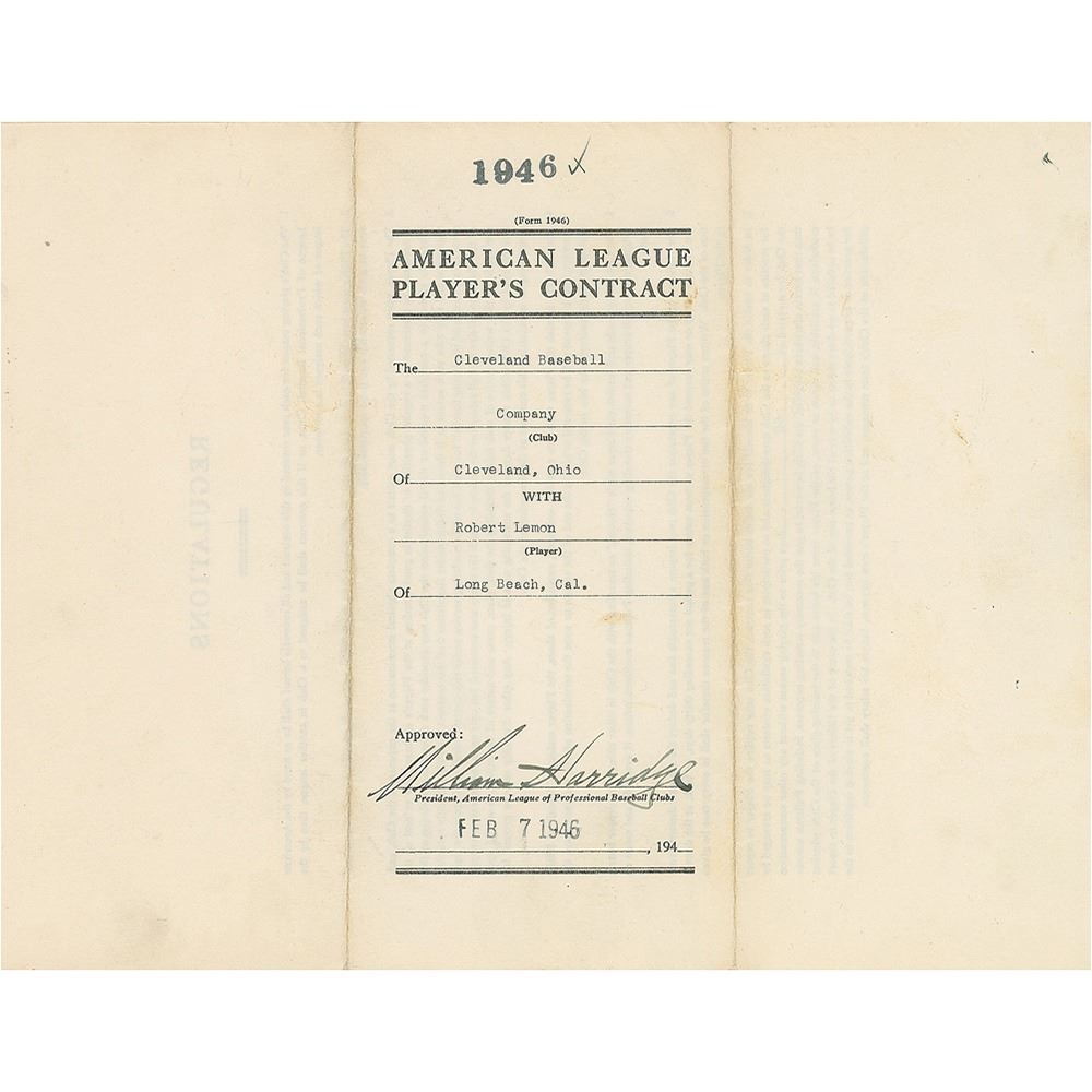 Contract, signed “Robert G. Lemon,” four pages on two adjoining sheets, 8.5 x 11, January 30, 1946. American League uniform player’s contract in which Bob Lemon agrees to render "skilled service as a baseball player…during the year 1946" for the Cleveland Indians, for a monthly salary of $800. Signed at the conclusion in blue ink by Lemon and countersigned by Indians General Manager Roger Peckinpaugh. The reverse is signed by American League President William Harridge. In fine condition. 1946 was Lemon's first full season on the way to a Hall of Fame career.