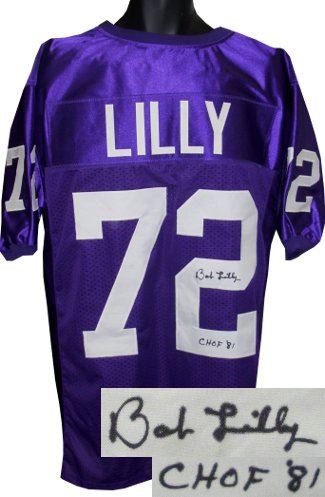 Bob Lilly played college football at Texas Christian University (TCU), where he was a two-time All-Southwest Conference pick and a consensus All-American. He was a 1961 member of the College Football All-America Team and was a 2006 inductee to the East-West Shrine Game Hall of Fame. Lilly was inducted into the College Football Hall of Fame in 1981. Bob Lilly has hand signed this TCU Horned Frogs Purple Custom Jersey with CHOF 81 inscription. Certificate of Authenticity from Athlon Sports.