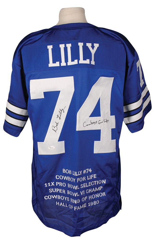 Replica Dallas Cowboys football jersey, with sewn on letters and numbers, as well as embroidered career highlights at the bottom of the back of the jersey, signed in black felt tip on the number on the back, “Bob Lilly, Cowboys for Life.” In fine condition, with a James Spence authentication label affixed to number. Accompanied by a certificate of authenticity from James Spence.