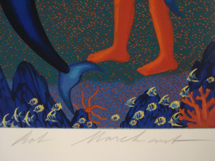 This vivid art print portrays the excitement of feeling as one with the dolphins, in the tropical waters. Artist: Bob Marchant Title: "Swimming with Dolphins" Medium: Serigraph on paper Signature: In pencil, lower right Edition: Numbered in pencil 523/650 Sheet size: 15 x 15 1/4 inches Certificate of Authenticity: Included Biography * Bob Marchant (Australia, b. 1938) is one of Australia's most respected contemporary artists. His rich palette and bold imagery continue to attract a large and avid group of collectors. *