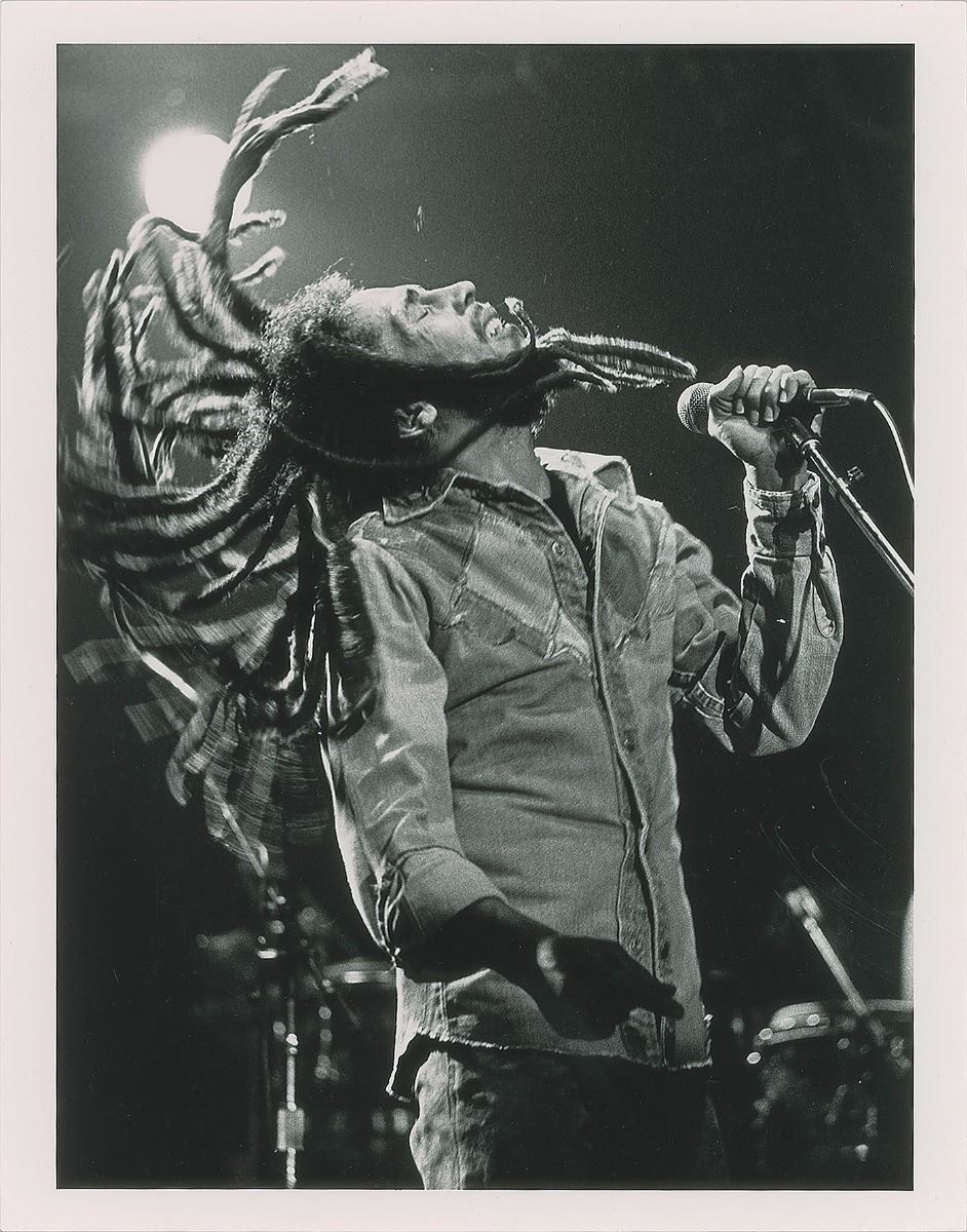 Stunning original glossy 11 x 14 photo of Marley throwing back his hair while on stage by Richard Creamer. In fine condition. Provenance: Richard Creamer Estate.