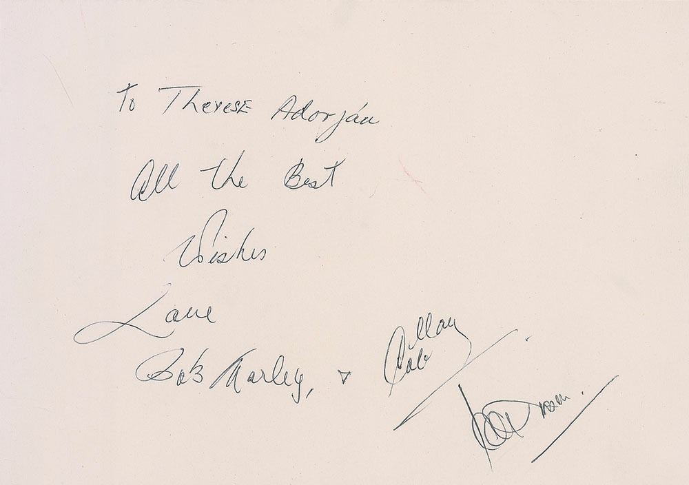 Ballpoint signature and inscription, "To Terese Adorjan, All the best wishes, Love, Bob Marley," on an off-white 8.25 x 6 sheet. Sheet is also signed by Marley's friend and owner of Tuff Gong Records, soccer star Alan Cole, and also signed by one other member of Marley's entourage. In fine condition. Accompanied by a statement of provenance which reads, in part: "This autograph of Bob Marley was signed at Christmas 1980 in person by Bob Marley in Rottach-Egern, Bavaria, Germany. The recipient of this signed autograph was Mrs. Terese Adorjan, who was the secretary of Bob Marley's personal doctor-Dr. Issels...while he was treated for cancer for several months...until a few days prior to his untimely death at age 36...Mrs. Adorjan saw Bob Marley each day for several months and was given this autograph by Marley as a personal Christmas present." Statement includes an image of Adorjan holding the signature. A magnificent example of one of music's most desirable and elusive signatures. Pre-certified REAL.