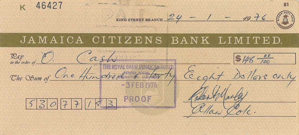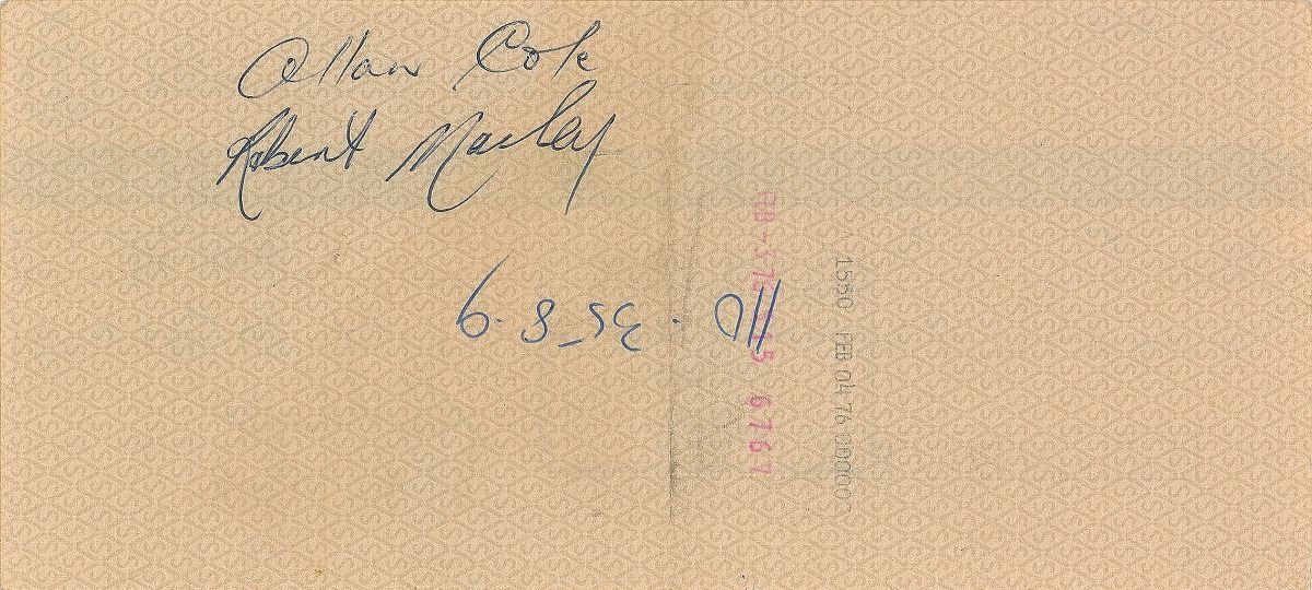 Amazing twice-signed Jamaica Citizens Bank Limited check, 8 x 3.5, filled out in another hand and signed by Marley, “Robert Marley,” payable to cash for $148, January 24, 1976, and endorsed on the reverse by Marley in the same manner. Also signed and endorsed by Allan Cole, road manager of The Wailers who is controversially credited with writing their song ‘War.’ In fine condition. The year 1976 saw Marley’s breakthrough in the United States with the release of Rastaman Vibration, which featured the now-classic songs ‘Positive Vibration,’ ‘Roots, Rock, Reggae,’ and ‘War.’ He followed up this effort in 1977 with Exodus—widely considered his greatest album—which secured him international stardom with the major hits ‘Jamming,’ ‘Waiting in Vain,’ and ‘One Love/People Get Ready.’ Marley is exceedingly rare in checks; this is the only one that has appeared on the market since his death 35 years ago.
