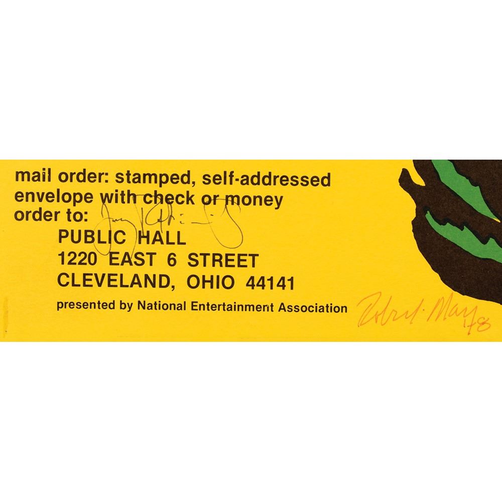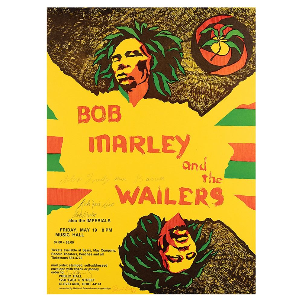 An exceptionally rare and beautiful original color 16 x 21.75 poster for a Bob Marley and the Wailers concert at the Music Hall in Cleveland, Ohio, on May 19, 1978, signed in black ballpoint, “Rasta Fari Live, Bob Marley” and “Aston Family Mon Barrett.” The lower right corner is also signed in black ink by the poster’s artist, Jay Rabinowitz, who, in an included letter of provenance, details the poster’s design, which incorporates ‘the Rastafarian tradition of red (blood shed/sacrifice), yellow/gold (wealth/sunshine) and green (fertile land of Ethiopia/Africa) in horizontal stripes; my hand-drawn silhouette of Bob Marley, eyes shut with raised arm and guitar, and dreadlocks of green Ganga; a graphic emblem of a Ganga leaf above a black and red vortex; The design is intended to evoke an image of resistance, remembrance and power.’ The lower portion is signed by one other. Affixed to a same-size mount and in fine condition. A magnificent display piece that represents the power and vibrancy of Marley and his reggae revolution.