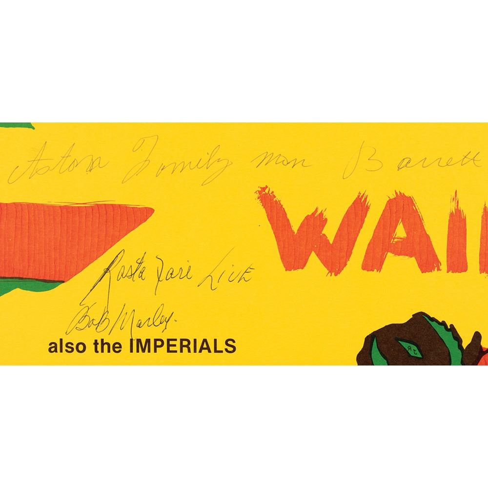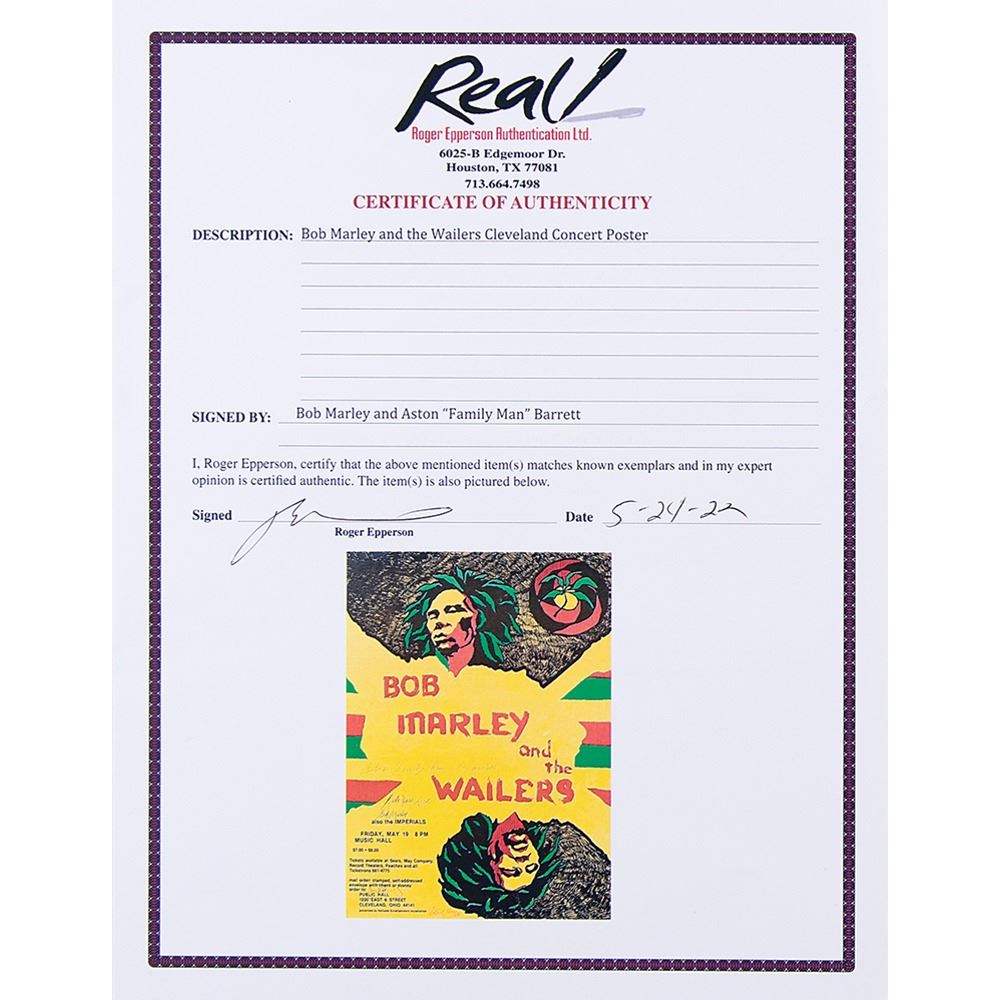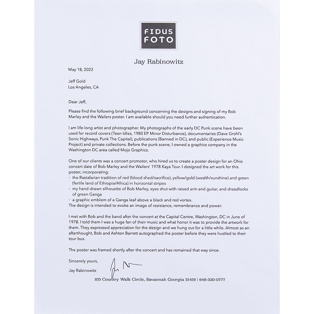 Accompanied by a certificate of authenticity from REAL and the referenced provenance letter from Rabinowitz, who states: “I am a life-long artist and photographer…I owned a graphics company in the Washington DC area called Mojo Graphics. One of our clients was a concert promotor, who hired us to create a poster design for an Ohio concert date of Bob Marley and the Wailers’ 1978 Kaya Tour…I met with Bob and the band after the concert at the Capital Centre, Washington, DC in June of 1978. I told them I was a huge fan of their music and what an honor it was to provide the artwork for them. They expressed appreciation for the design and we hung out for a little while. Almost as an afterthought, Bob and Aston Barrett autographed the poster before they were hustled to their tour bus.”