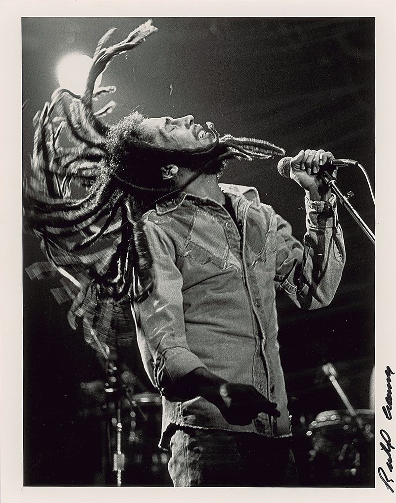 Original glossy 11 x 14 photo of Marley flipping his dreadlocks on stage, by Richard Creamer. Signed vertically in the right border in black felt tip by Creamer. In very fine condition. Provenance: Richard Creamer Estate. Creamer was a famous Rolling Stone photographer very active and well known in the 1970s Los Angeles Rock scene. The collection of Creamer photos offered in this auction were kept in his personal collection and several appeared in magazines.