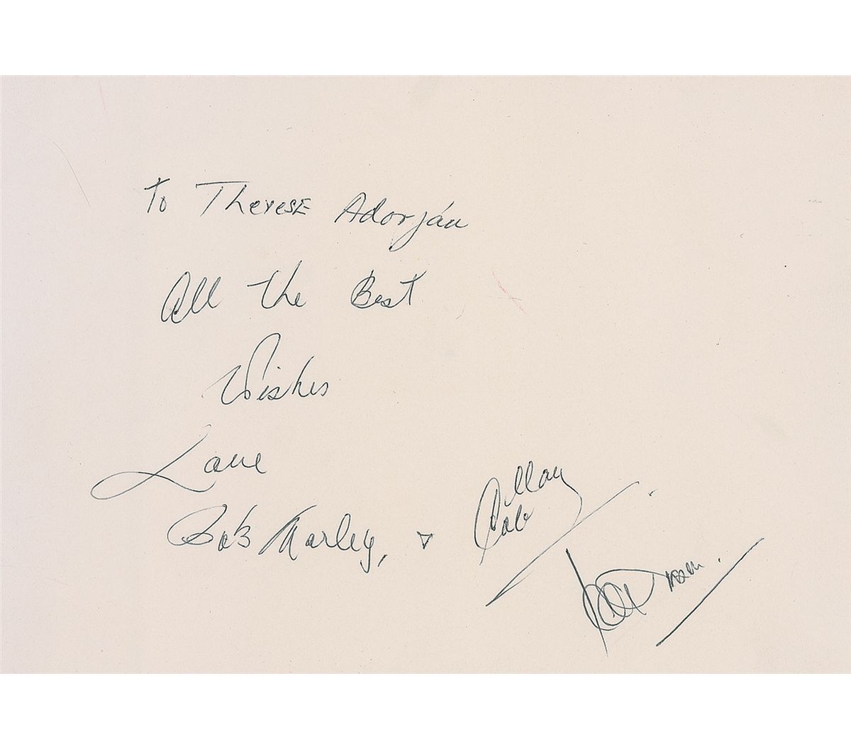 Ballpoint signature and inscription, “To Terese Adorjan, All the best wishes, Love, Bob Marley,” on an off-white 8.25 x 6 sheet. Sheet is also signed by Marley’s friend and owner of Tuff Gong Records, soccer star Alan Cole, and also signed by one other member of Marley‘s entourage. In fine condition. Accompanied by a statement of provenance which reads, in part: “This autograph of Bob Marley was signed at Christmas 1980 in person by Bob Marley in Rottach-Egern, Bavaria, Germany. The recipient of this signed autograph was Mrs. Terese Adorjan, who was the secretary of Bob Marely’s personal doctor—Dr. Issels…while he was treated for cancer for several months…until a few days prior to his untimely death at age 36…Mrs. Adorjan saw Bob Marley each day for several months and was given this autograph by Marley as a personal Christmas present.” Statement includes an image of Adorjan holding the signature. A magnificent example of one of music’s most desirable and elusive signatures.