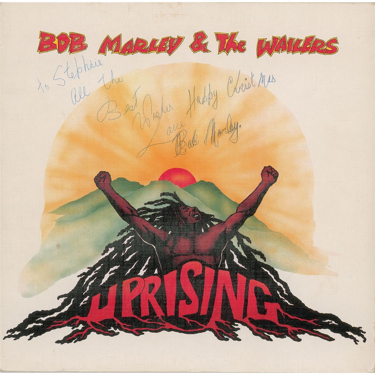 German pressing of Marley’s Uprising album signed and inscribed on the front cover in blue ballpoint, “To Stephnie, all the Best Wishes Happy Christmas, Love, Bob Marley.” Marley has traced over his signature a couple of times to make it bolder. In fine condition, with aforementioned tracing over of signature and a mild album impression to front cover. The record is included. Accompanied by a letter of provenance from the original recipient which reads, in part: “We have a house in Rottach-Egern on Lake Tegern (Bavaria)…that we used to rent out as a vacation house. At one point an English doctor came to us and rented the house for a cancer patient and several other people…my parents learned that it was dealing with Bob Marley, who was undergoing cancer treatment with the former ‘miracle doctor’ Dr. Issels. The doctor had rented the house for several weeks…Bob Marley probably left the house in the dark early in the morning to go to Dr. Issel’s clinic and returned in the dark late in the evening…My mother explains that the house had been totally overheated to the point that the balconies were warped! Bob Marley…moved to somewhere else. At that time, we had only seen his mother and his entourage, since other opportunities still had to be regulated. My mother asked for an autograph for her children and then we got these albums (Kaya for my sister and Uprising for me, Stephanie).” Issels, a world famous cancer expert, treated Marley for several months in late 1980 until a few days prior to Marley’s untimely death at age 36. Provenance: Christies, May 25, 2006.