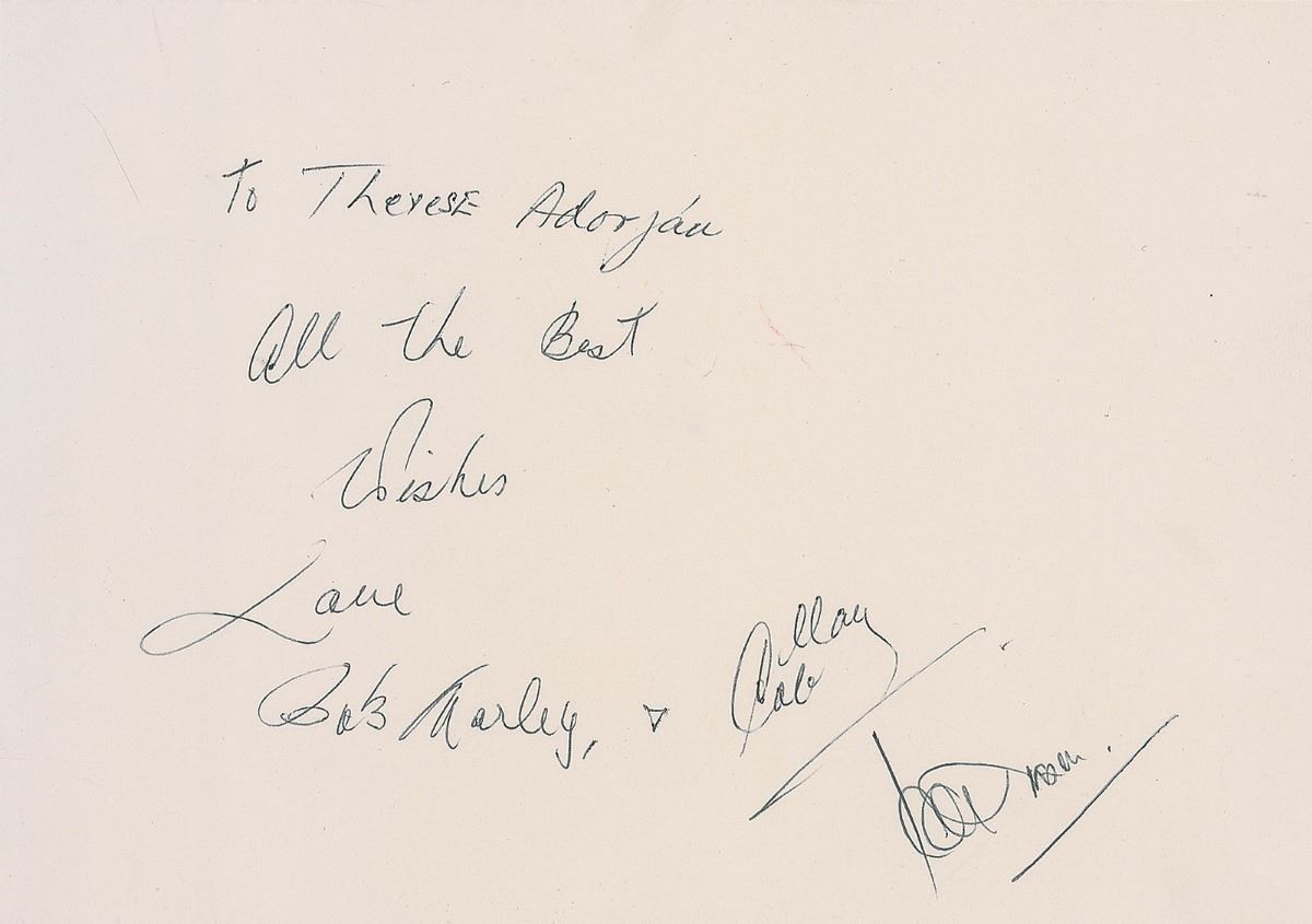 Ballpoint signature and inscription, “To Terese Adorjan, All the best wishes, Love, Bob Marley,” on an off-white 8.25 x 6 sheet. Sheet is also signed by Marley’s friend and owner of Tuff Gong Records, soccer star Alan Cole, and also signed by one other member of Marley‘s entourage. In fine condition. Accompanied by a statement of provenance which reads, in part: “This autograph of Bob Marley was signed at Christmas 1980 in person by Bob Marley in Rottach-Egern, Bavaria, Germany. The recipient of this signed autograph was Mrs. Terese Adorjan, who was the secretary of Bob Marley’s personal doctor—Dr. Issels…while he was treated for cancer for several months…until a few days prior to his untimely death at age 36…Mrs. Adorjan saw Bob Marley each day for several months and was given this autograph by Marley as a personal Christmas present.” Statement includes an image of Adorjan holding the signature. A magnificent example of one of music’s most desirable and elusive signatures.