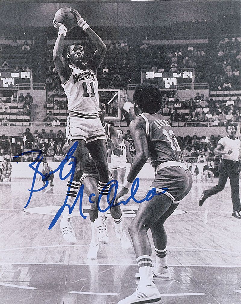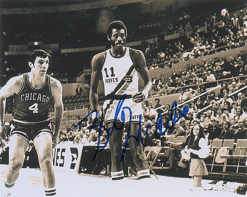 Two satin-finish photos of McAdoo on the court for the Buffalo Braves, one 8 x 10 and one 10 x 8, each signed in blue felt tip. In fine condition.