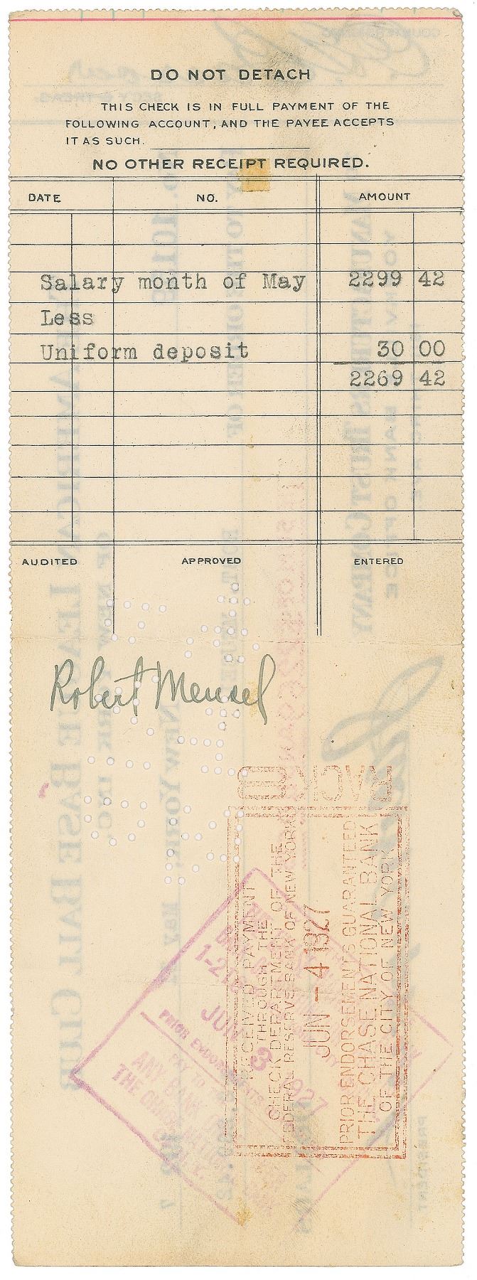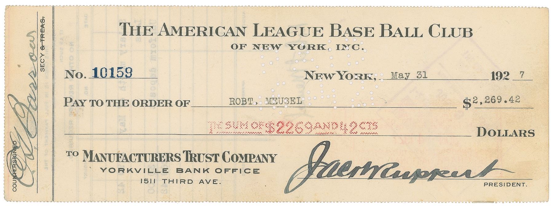 The American League Base Ball Club of New York check, 9 x 3.25, filled out in type and signed by Ruppert, "Jacob Ruppert," and vertically countersigned by Barrow, "E. G. Barrow," payable to Robt. Meusel for $2269.42, May 31, 1927. Endorsed on the reverse by Meusel, "Robert Meusel." The check covers Meusel's salary for the month of May, minus a $30 uniform deposit. In fine condition. An excellent triple-signed Yankees paycheck from the iconic 1927 season, featuring the team's Hall of Fame owner and general manager, plus the fifth slugger in their famed 'Murderer's Row' lineup, who had led the league in homers just two years earlier.