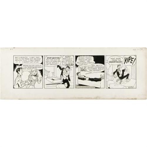 <B>Bob Montana - Archie Daily Comic Strip Original Art, dated 2-22-46 (McClure Syndicate, 1946).</B></I> Jughead and Betty star in this, the seventeenth Archie daily. This strip has an image area of 19" x 5", and aside from some staining in the bottom border (outside the image area), the art is in Excellent condition.<BR><BR><b>Shipping:</b> Flat Material, Large (<a target="_blank" href="http://www.heritageauctions.com/common/shipping.php">view shipping information</a>)