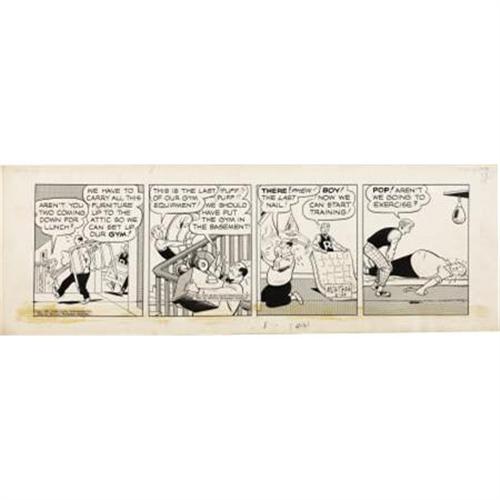 <B>Bob Montana - Archie Daily Comic Strip Original Art, dated 2-24-47 (McClure Newspaper Syndicate, 1947). </B></I> Archie and his dad get a workout getting ready for a workout, in this Bob Montana daily. The art has an image area of 19" x 5.5", and, aside from light paper tanning, and glue staining along the bottom edge, is in Very Good condition.<BR><BR><b>Shipping:</b> Flat Material, Small (<a target="_blank" href="http://www.heritageauctions.com/common/shipping.php">view shipping information</a>)