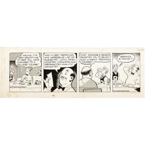 <B>Bob Montana - Archie Daily Comic Strip Original Art, dated 6-2-47 (McClure Newspaper Syndicate, 1947). </B></I> Archie's certainly got his college priorities! This Bob Montana daily has an image area of 19" x 5.5", and, aside from light paper tanning, and glue staining along the bottom edge, is in Very Good condition.<BR><BR><b>Shipping:</b> Flat Material, Small (<a target="_blank" href="http://www.heritageauctions.com/common/shipping.php">view shipping information</a>)