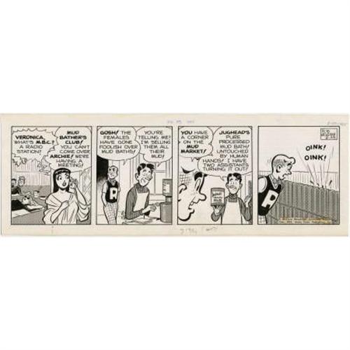 <B>Bob Montana - Archie Daily Comic Strip Original Art, dated 8-29-55 (McClure Newspaper Feature Copr., 1955).</B></I> Jughead takes control of the mud bath market with a little help from some hogs. Archie and Veronica co-star. This episode has an image area of 19" x 5.75", and the art is in Excellent condition.<BR><BR><b>Shipping:</b> Flat Material, Small (<a target="_blank" href="http://www.heritageauctions.com/common/shipping.php">view shipping information</a>)