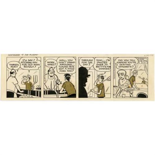 <B>Bob Montana - Archie Daily Comic Strip Original Art, dated 8-20-71 (King Features Syndicate, 1971).</B></I> With Jughead, Archie is always wise to expect the unexpected. Betty cameos. This daily has an image area of 18" x 5.25", and aside from yellowed Zipatone, the art is in Very Good condition.<BR><BR><b>Shipping:</b> Flat Material, Small (<a target="_blank" href="http://www.heritageauctions.com/common/shipping.php">view shipping information</a>)