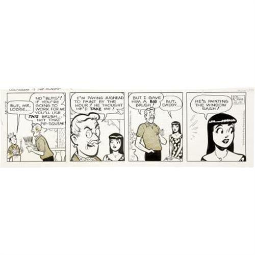 <B>Bob Montana - Archie Daily Comic Strip Original Art, dated 10-10-70 (King Features Syndicate, 1970).</B></I> Veronica stars in three panels of this episode. Jughead and Mr. Lodge co-star. This daily has an image area of 18" x 5.25", and aside from yellowed Zipatone, the art is in Very Good condition.<BR><BR><b>Shipping:</b> Flat Material, Small (<a target="_blank" href="http://www.heritageauctions.com/common/shipping.php">view shipping information</a>)