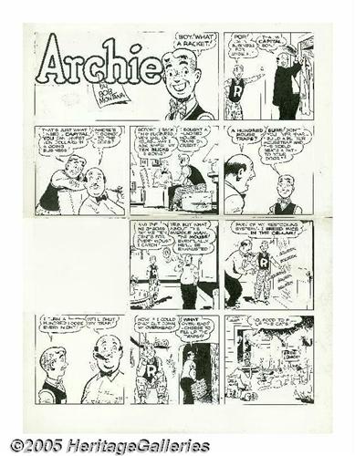 <B>Bob Montana - Archie Sunday Comic Strip Original Art, dated 4-27-47 (Archie Comics, 1947).</B></I> Yep, this is what you think it is...an original piece of art from one of comicdom's hottest properties. It seems that everyone and his brother wants a piece of the action, so we're offering a chance to impress all your friends. This piece by Bob Montana is absolutely top-of-the-line. This is a hilarious strip in which Archie goes into business for himself trying to build the better mouse trap. Be the envy of all you know with this epochal piece. This huge Sunday has very minimal white-out and measures 30" x 22." Unfortunately, for some reason that might never be known, there is one panel that has been clipped and is missing.