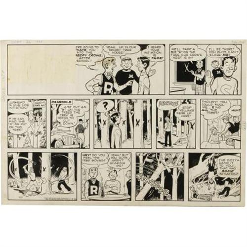 <B>Bob Montana - Archie Sunday Comic Strip Original Art, dated 9-26-48 (McClure Syndicate, 1948).</B></I> Jughead takes the fall in Archie's clubhouse initiation. This strip has an image area of 20.5" x 14.5", and aside from a missing title logo stat and a few small stains, the art is in Very Good condition.<BR><BR><b>Shipping:</b> Flat Material, Large (<a target="_blank" href="http://www.heritageauctions.com/common/shipping.php">view shipping information</a>)