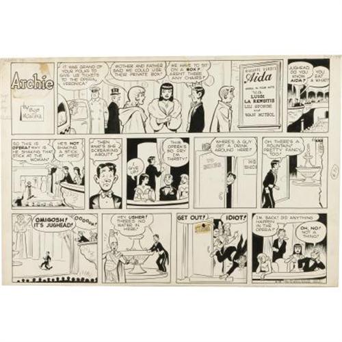 <B>Bob Montana - Archie Sunday Comic Strip Original Art, dated 3-13-49 (McClure Syndicate, 1949).</B></I> Much to Archie, Betty, and Veronica's amazement, Jughead makes his stage debut. This strip has an image area of 20.5" x 14.5", and aside from a missing lettering correction and a few small stains, the art is in Excellent condition.<BR><BR><b>Shipping:</b> Flat Material, Large (<a target="_blank" href="http://www.heritageauctions.com/common/shipping.php">view shipping information</a>)