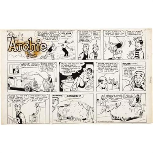 <B>Bob Montana - Archie Sunday Comic Strip Original Art, dated 1-4-48 (McClure Newspaper Syndicate, 1948).</B></I> Archie will do anything to help Veronica win the winter sports parade float competition, even total his convertible! This Bob Montana Sunday has an image area of 21" x 14". Aside from some paper tanning, and light soiling, the art is in Very Good condition.<BR><BR><b>Shipping:</b> Flat Material, Large (<a target="_blank" href="http://www.heritageauctions.com/common/shipping.php">view shipping information</a>)