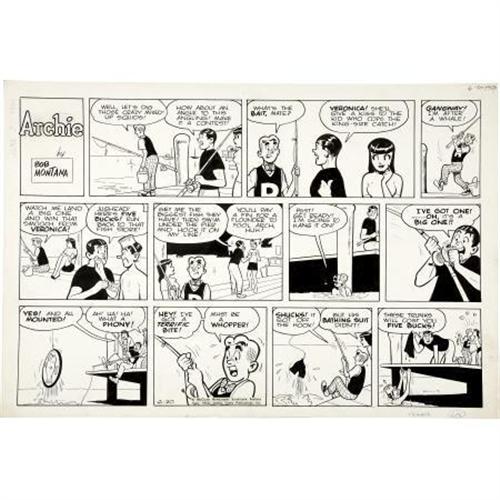 <B>Bob Montana - Archie Sunday Comic Strip Original Art, dated 6-20-54 (McClure Syndicate, 1954).</B></I> Reggie's half-baked plot to steal a kiss from Veronica backfires thanks to Jughead. Archie gets his reward in the last panel. The image area of this Sunday measures 20.5" x 13.75", and the art is in Excellent condition.<BR><BR><b>Shipping:</b> Flat Material, Large (<a target="_blank" href="http://www.heritageauctions.com/common/shipping.php">view shipping information</a>)