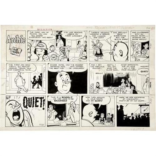 <B>Bob Montana - Archie Sunday Comic Strip Original Art, dated 9-20-59 (McClure Syndicate, 1959).</B></I> Mr. Weatherbee has a captive audience when he "instructs" the Riverdale High student body with slides of his summer vacation. Mr. Flutesnoot, Miss Haggly, and Miss Grundy cameo. The image area of this Sunday measures 20.5" x 13.75", and the art is in Excellent condition.<BR><BR><b>Shipping:</b> Flat Material, Large (<a target="_blank" href="http://www.heritageauctions.com/common/shipping.php">view shipping information</a>)
