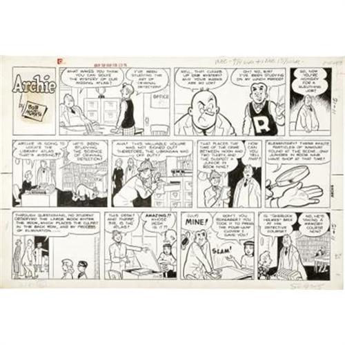 <B>Bob Montana - Archie Sunday Comic Strip Original Art, dated 11-15-59 (King Features Syndicate, 1959).</B></I> To the amazement of Mr. Weatherbee, Archie solves his own crime. Betty and Veronica cameo. This strip has an image area of 20.5" x 13.75", and aside from a glue-stained title logo, the art is in Excellent condition.<BR><BR><b>Shipping:</b> Flat Material, Large (<a target="_blank" href="http://www.heritageauctions.com/common/shipping.php">view shipping information</a>)