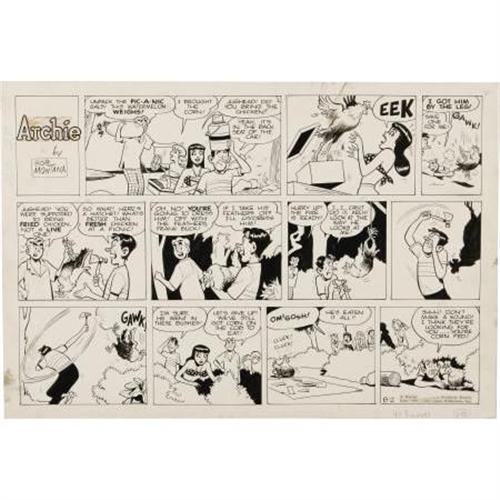 <B>Bob Montana - Archie Sunday Comic Strip Original Art, dated 8-2-53 (McClure Newspaper Syndicate, 1953). </B></I> Bob Montana's art is at its most refined in this hilarious Sunday starring the whole Riverdale gang -- Archie, Jughead, Betty and Veronica. This strip has an image area of 20.5" x 14, and aside from a few small stains, the art is in Excellent condition.<BR><BR><b>Shipping:</b> Flat Material, Large (<a target="_blank" href="http://www.heritageauctions.com/common/shipping.php">view shipping information</a>)