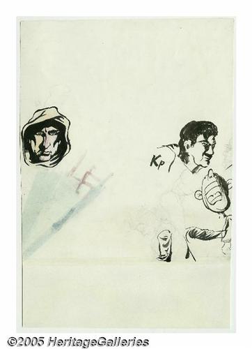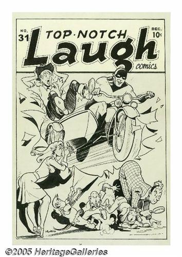 <B>Bob Montana - Top-Notch Laugh Comics #31 Cover Original Art (MLJ, 1942).</B></I> Black Hood, Pokey Oakey, Snoop McGook, Suzie, and the Three Monkeyteers all make their presence known on this outstanding Bob Montana cover. Sure, the Black Hood and his motorcycle are the center of attention, but we can't help being drawn to Suzie's ample charms; she can point her camera at us any day! Montana's virtuoso inking ties it all together nicely. One interesting element of the artwork is Snoop McGook's "see-through" hat, which Montana apparently added at the last moment, getting rid of the unnecesary lines in the production process. As an added bonus, the back side of the cover features a few doodles, and a fully inked image of a hooded man. This Golden Age gem has an image area of 11.5" x 17", and the art is in Excellent condition. The logo is a well-done recreation. MLJ leads the way, so add this stunner to your portfolio!