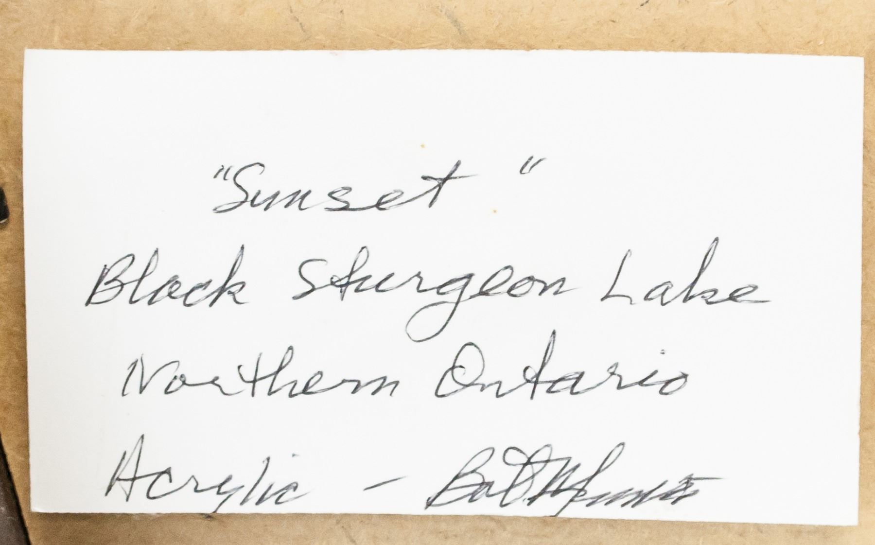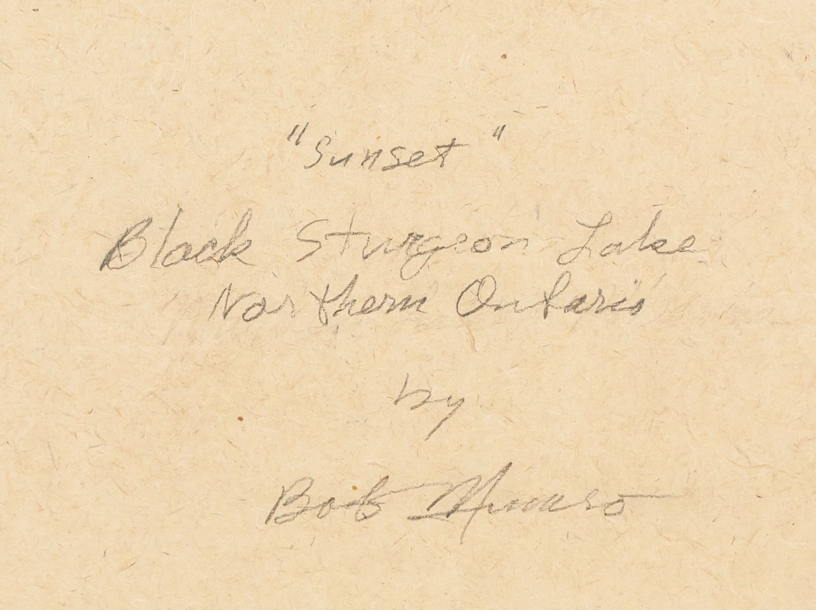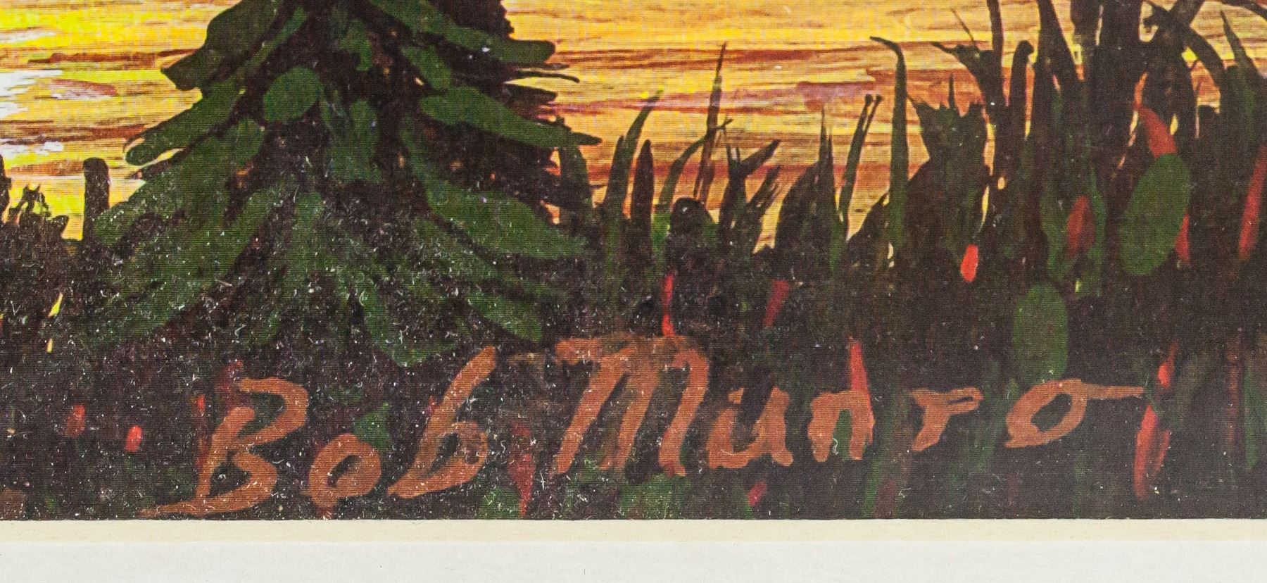 Print on paper, framed. Featuring sunset over water. "Bob Munro" near bottom of image. "Sunset Black Sturgeon Lake Northern Ontario by Bob Munro" inscribed on verso. "Print 2/5" inscribed on verso. 26.5 x 34 cm (10.5 x 13.5 in), Frame: 44 x 54 cm (17 x 21 in).