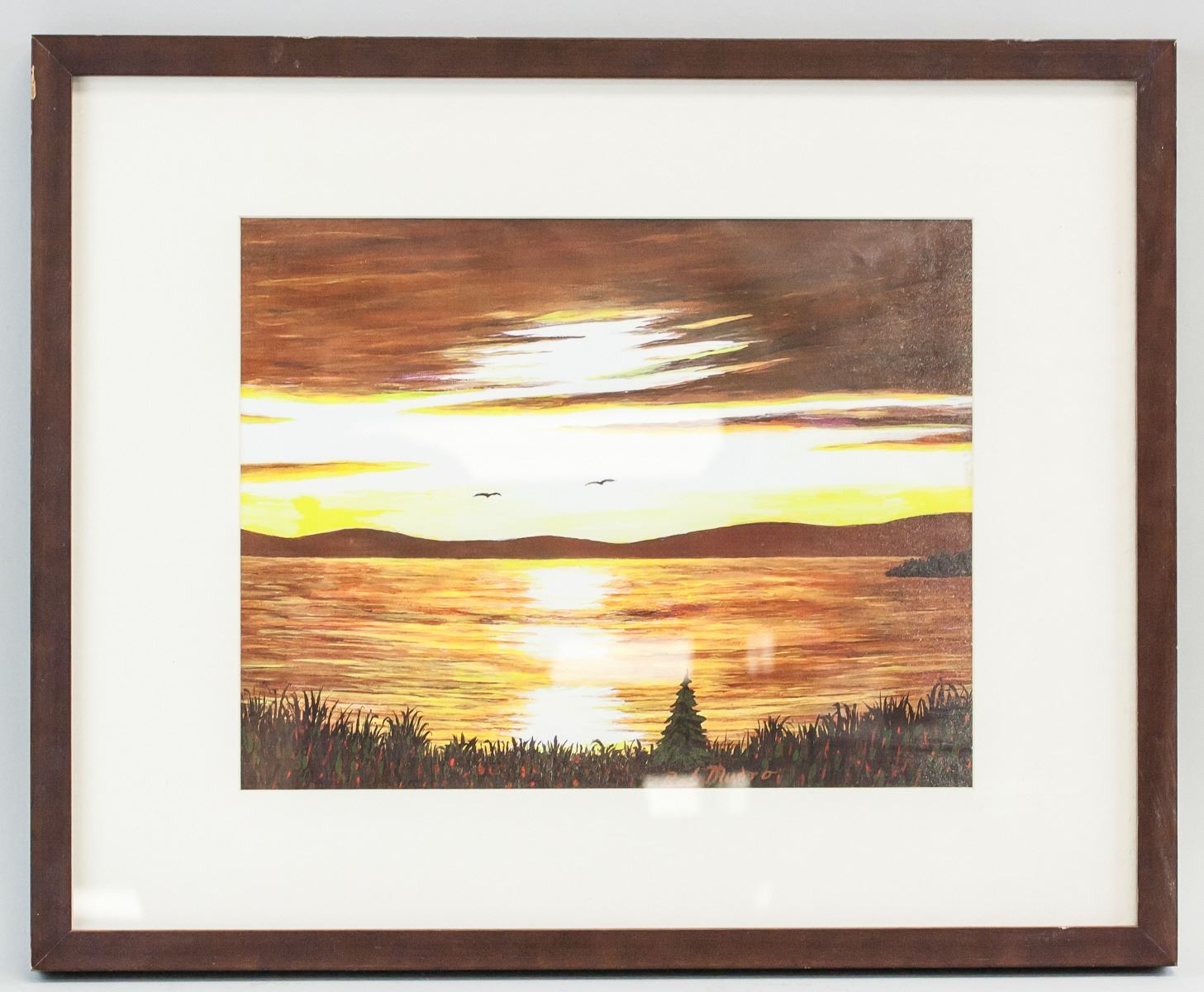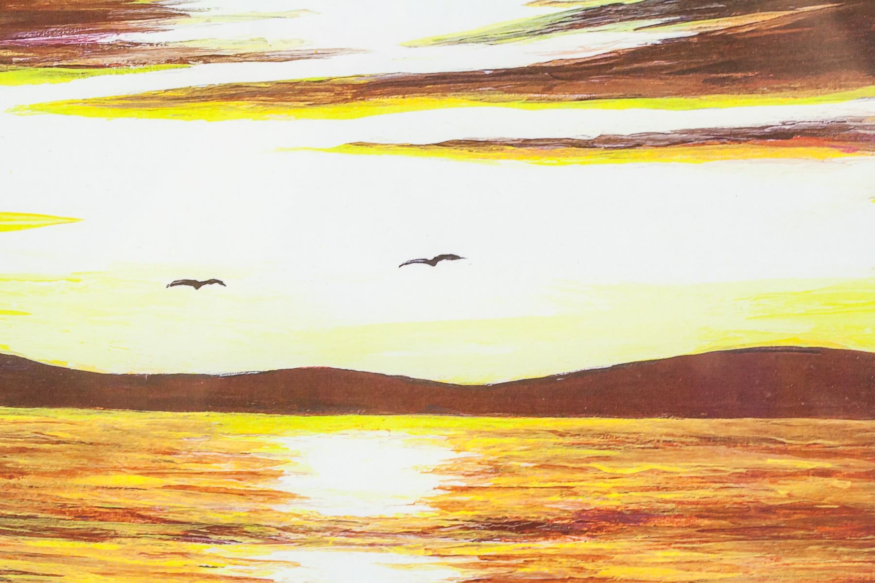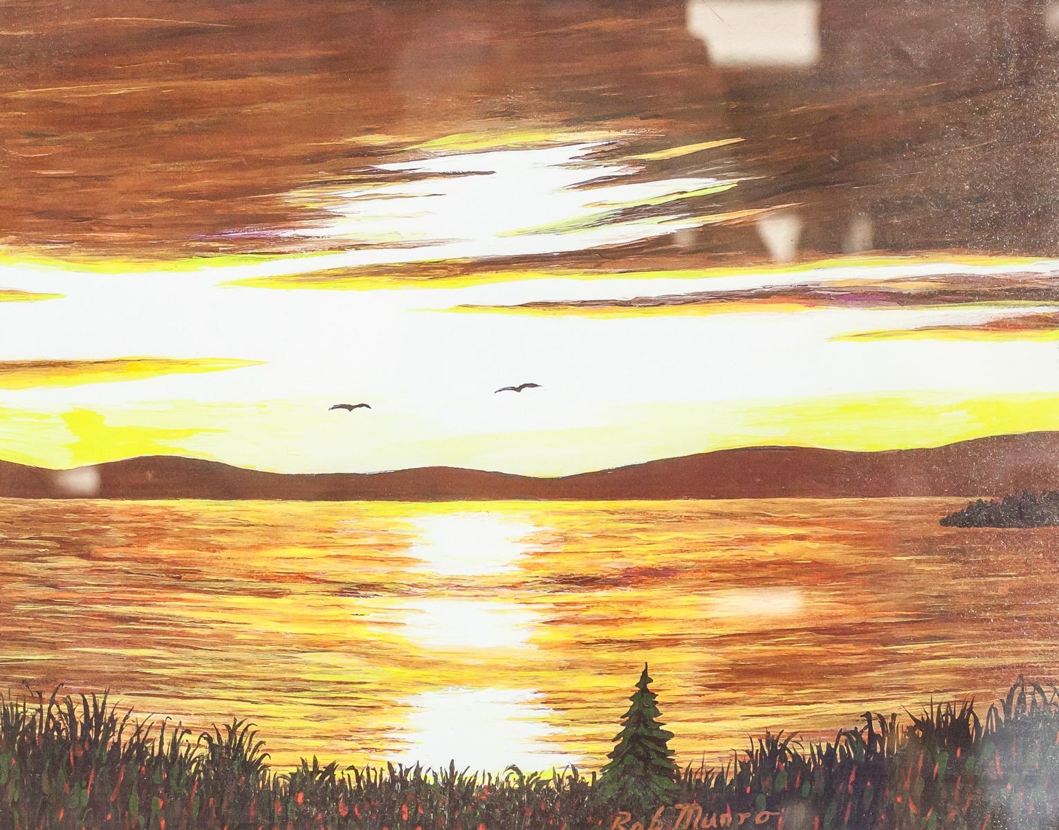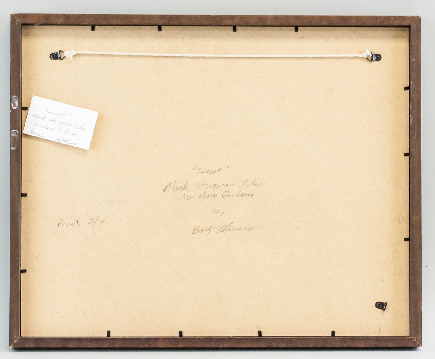 Print on paper, framed. Featuring sunset over water. "Bob Munro" near bottom of image. "Sunset Black Sturgeon Lake Northern Ontario by Bob Munro" inscribed on verso. "Print 2/5" inscribed on verso. 26.5 x 34 cm (10.5 x 13.5 in), Frame: 44 x 54 cm (17 x 21 in).