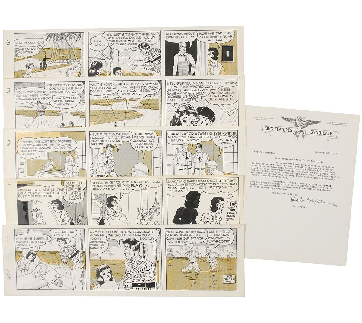 Collection of six items: five original hand-inked Big Sister daily comic strips, all approximately 17.5 x 5.5, each signed in the final panel in black ink by Naylor; and a one-page TLS from 1972, sending the strips and announcing the final publication date for his Big Sister strip. In fine condition, with some mild toning and pencil marks to some of the strips.