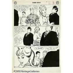 <B>Bob Oksner - The Many Loves of Dobie Gillis #22, page 3 Original Art (DC, 1963).</B></I> "The Many Loves of Dobie Gillis" aired on CBS on September 19, 1959 and continued until September 18, 1963 for a total of 147 episodes. DC Comics bought a license for the property, and began a series of comic books about the self-reflecting Dobie and his slacker pal, Maynard G. Krebs. Most issues were distinguished by Bob Oskner's stunningly cute girls, and this page from 1963 is no exception! Dobie and bongo bopping beatnik Maynard only have eyes for the cutie at the soda bar in this page by Oskner. The art measures 14.25" x 21.25" with a 13" x 18" image area. Some aging around the edges, otherwise this scrumptious piece is in Excellent condition.