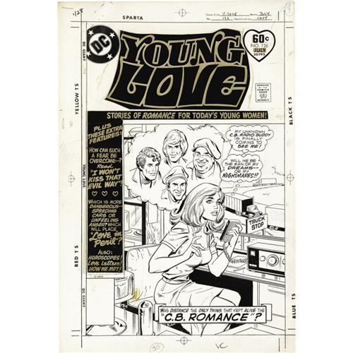 <B>Bob Oksner and Vince Colletta - Falling in Love #126 Cover Original Art (DC, 1977).</B></I> Before Al Gore invented the internet, love was often found over the C. B. radio -- ten-four! A fun-filled cover from the last issue of this hallowed romance title by veteran artists Bob Oksner and Vince Colletta. The image area measures approximately 10" x 15". The photostatted logos and type elements have darkened over time; otherwise, the art is in Very Good condition. Keep on truckin'! <BR><BR><B>Important notice:</B> Heritage usually auctions material at the rate of 200-250 lots per hour. On some occasions eBay Live bid software or the Internet may not be able to keep up with the pace of the auction. We recommend placing a realistic absentee bid now as insurance to avoid disappointment. Occasionally the auctioneer may eliminate or reject an eBay Live bid, and the auctioneer may also reopen a lot after the close of the eBay live bidding (usually because we missed an audience bid), and may reject your bid even if it shows you as the winning bidder. By bidding via eBay Live, you agree that Heritage may award the lot to another bidder at its sole discretion under the circumstances described above or any other reasonable circumstances. Since eBay bids are not shown to us until we open the lot on the floor, we treat those bids just like floor bids. In most cases the floor responds before the eBay bid is presented to us, due to Internet lag time, so for consistency we have made it a policy that floor bids are always considered first over tie eBay live bids. Also please note that all Heritage lots purchased through eBay Live carry a 22.5% Buyer's Premium. Please make sure you read the Terms and Conditions before you bid. This lot is being auctioned in conjunction with a live floor auction by Heritage Auction Galleries. All final auction and invoice information will be supplied by Heritage Auction Galleries, and all other information should be considered preliminary. Lot:41001 <BR><BR><B>Winning Notification and Billing:</B> After the FINAL session in this auction is complete, Heritage will send e-mail and snail mail invoices. This process normally takes several days. All final auction and invoice information will be supplied by Heritage Auction Galleries, and all other information should be considered preliminary. <BR><BR>This auction will be conducted on a live auction floor and over the Internet through eBay Live. If you choose to place an absentee bid, please take a moment to <font color='#0000ff'><u><a href='http://pages.ebay.com/liveauctions/help/before/laabsentee.html'>learn how eBay Live absentee bidding works</a></u></font><font color='#000000'>