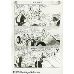 <B>Bob Oksner (attributed) - The Adventures of Bob Hope #78, page 16 Original Art (DC, 1962).</B></I> With sales of superhero comics slagging in the 1950s, DC Comics turned to humor to kick up sales and produced comic books based on comedy film stars such as Jerry Lewis and the ever-popular Bob Hope. Beginning in 1950, DC began publishing <B>The Adventures of Bob Hope</B></I>, a comic book series which kept Bob Hope's antics intact, including his quick one-liners, wise-cracks and off-kilter persona. This snappy page from <B>The Adventures of Bob Hope</B></I> #78 by Bob Oksner features Hope and company taking the wheel of a powerful racing car. Oksner sums up the dubious face of Hope with a dash of perfectly placed lines. The art measures 15" x 21" with a 13" x 18" image area. There is some slight aging apparent, otherwise the work is in Excellent condition.