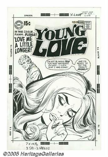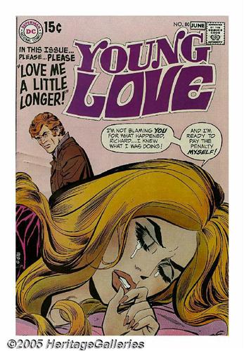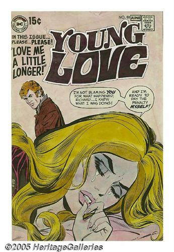 <B>Bob Oksner (attributed) and Vince Colletta - Young Love #80 Cover Original Art (DC, 1969).</B></I> Liz is only the latest in a long line of women loved and then tossed aside by Richard the famous actor -- so why should she be any different? It's all tears on this melodramatic Bob Oksner cover, but we're willing to bet there's a happy ending just around the bend. The image area measures 10" x 15" and the art is in Excellent condition; also included are a hand-painted color guide, a color proof of the cover, and a copy of the printed comic.