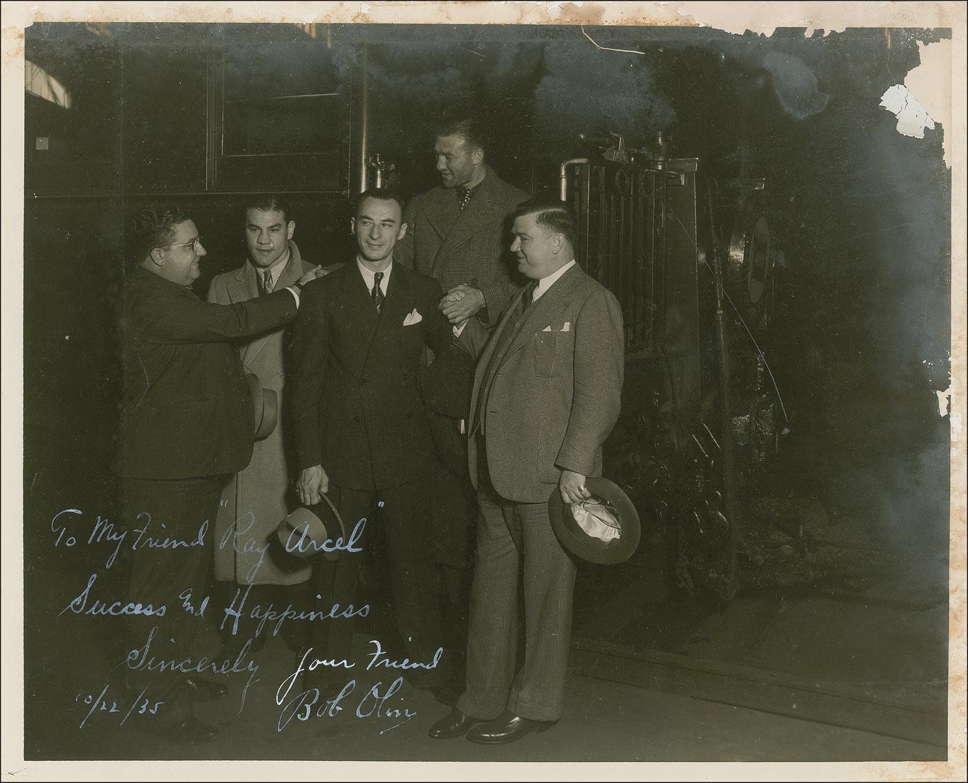 Boxer (1908–1956) who once held the World Light Heavyweight championship. Vintage pearl-finish 9.75 x 8 photo, signed and inscribed in black ink “To My Friend ‘Ray Arcel,’ Success and Happiness. Sincerely, Your Friend, Bob Olin. 10/22/35.” Few scattered creases, soiling, moderate to heavy flaking of the emulsion at the top right corner, silvering to the darker areas, otherwise very good condition. The central area and signature can be carefully trimmed or matted to eliminate the affected areas.